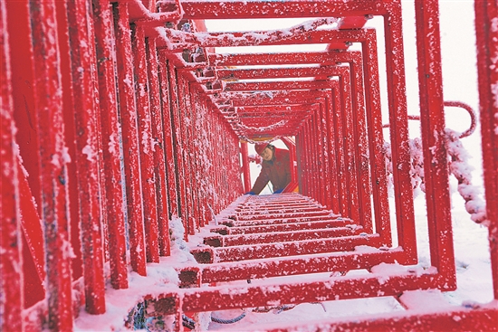 ②1月1日,新疆克拉瑪依,準(zhǔn)東鉆井公司70126鉆井隊(duì)石油工人冒著嚴(yán)寒正在中佳602井場(chǎng)巡檢設(shè)備設(shè)施,為快速安裝贏得先機(jī)。周建玲 攝