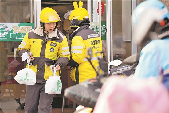 ?1月1日,安徽省六安市橫排頭路一家快餐店門(mén)前,幾名外賣小哥正在取餐外送。田凱平 攝