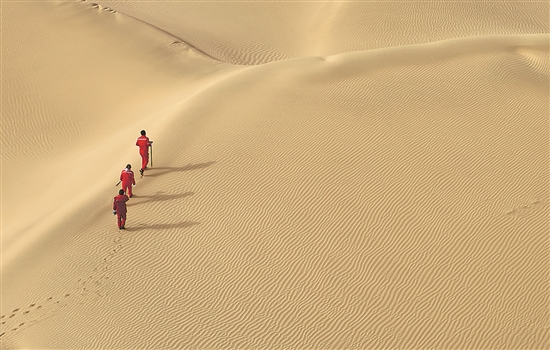 ⑤1月1日,中國(guó)石油集團(tuán)東方物探公司219隊(duì)測(cè)量員在新年第一天行走在塔克拉瑪干沙漠里。王健 攝