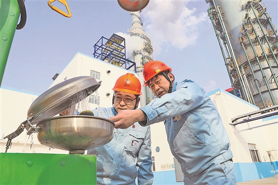 ?1月1日,山東淄博齊魯石化公司熱電廠乙烯動(dòng)力站黨支部書(shū)記劉紅旗(圖左)和脫硫?qū)9ね蹙齽傇跈z查設(shè)備。夏東明 攝