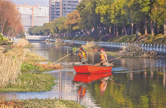 ?1月1日,江蘇省海安市的河道保潔人員在洋港河清理雜草和河面漂浮物。翟慧勇 攝