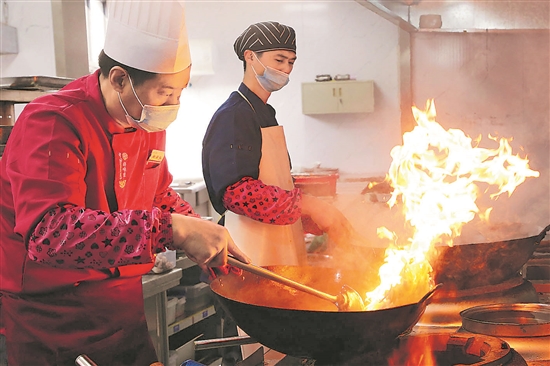 ?1月1日,江蘇省連云港市連云區(qū)桃園社區(qū)“為民大食堂”的廚師尚興龍(圖左)在烹制菜肴。朱華南 攝