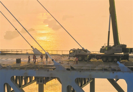 ⑩1月1日,中交二航局的建設(shè)者在常泰長(zhǎng)江大橋建設(shè)現(xiàn)場(chǎng)進(jìn)行作業(yè)(無(wú)人機(jī)照片)。湯德宏 攝
