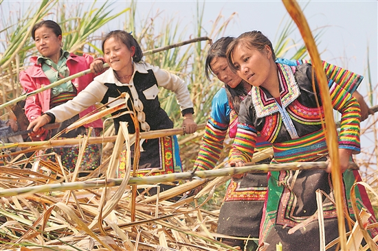 ③1月1日,云南省臨滄市鎮(zhèn)康縣南傘鎮(zhèn)田壩村苗族群眾在砍收甘蔗。穆王成 攝