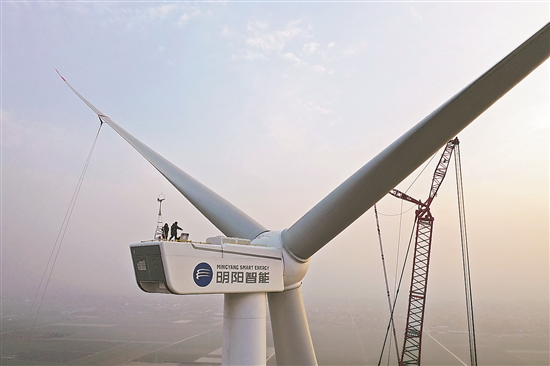⑧1月1日,在河南省焦作市溫縣子夏風(fēng)電場(chǎng),工人在安裝調(diào)試風(fēng)力發(fā)電機(jī)組。徐宏星 攝