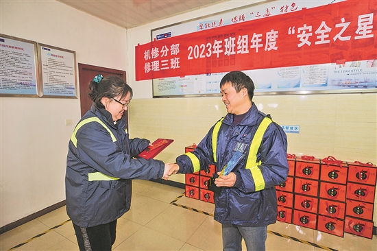 2023年12月22日,在浙江省寧波舟山港股份有限公司北侖礦石碼頭分公司機(jī)修分部,一場(chǎng)別開生面的班組“安全之星”“工時(shí)之星”表彰會(huì)在修理三班舉行,以嘉獎(jiǎng)2023年度在班組安全管理和提升工作效率等方面表現(xiàn)優(yōu)秀的職工。圖為班組“安全之星”王晟(右)領(lǐng)獎(jiǎng)的場(chǎng)景。蔣曉東 攝