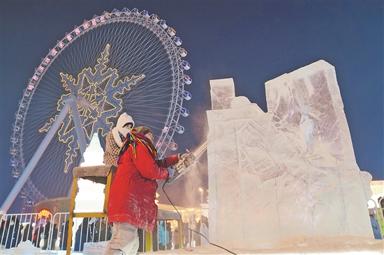 1月2日,在冰雪大世界園區(qū)內(nèi),參賽選手在進(jìn)行冰雕創(chuàng)作。