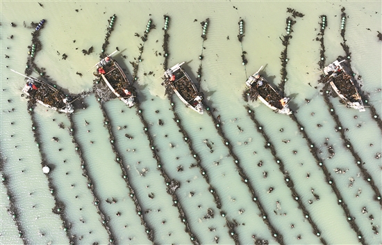 圖為山東省榮成市愛(ài)倫灣海域海帶養(yǎng)殖區(qū)內(nèi),漁民在海帶采收季節(jié)勞動(dòng)的場(chǎng)景。山東深挖海洋漁業(yè)發(fā)展?jié)摿Γ塾?jì)創(chuàng)建國(guó)家級(jí)海洋牧場(chǎng)67個(gè)、約占全國(guó)40%。據(jù)初步測(cè)算,2023年前三季度,山東海洋生產(chǎn)總值達(dá)到1.26萬(wàn)億元,同比增長(zhǎng)6.3%。 新華社發(fā)(李信君 攝)
