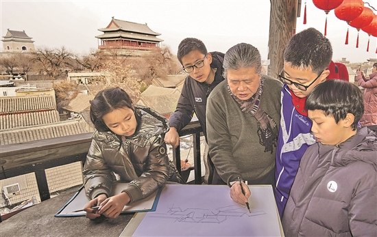 楊信(左三)在指導(dǎo)少年“京味繪畫”愛好者們進行戶外寫生。楊信是一位“京味畫家”,從小愛好繪畫的他從母親手里傳承了老北京繪畫顏料調(diào)制的技藝,迄今成為第五代傳承人。
