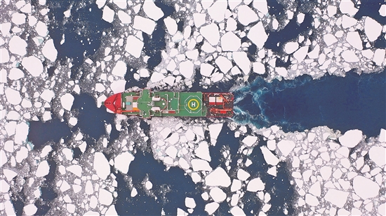 北京時(shí)間1月6日,執(zhí)行中國(guó)第40次南極考察任務(wù)的“雪龍2”號(hào)在阿蒙森海為潛標(biāo)布放開(kāi)辟水道。