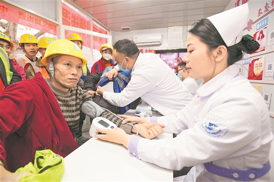 1月9日,在中建四局華潤(rùn)置地貴陽(yáng)九悅綜合體項(xiàng)目部勞動(dòng)者驛站,貴州省第四人民醫(yī)院的醫(yī)護(hù)人員正為建設(shè)者們開展健康義診。當(dāng)日,貴陽(yáng)市南明區(qū)遵義路街道聯(lián)合該市第四人民醫(yī)院等單位通過(guò)“暖冬”慰問的形式為堅(jiān)守建設(shè)一線的城市建設(shè)者送上寒冬祝福,保障工友們的身體健康。本報(bào)通訊員 趙松 攝