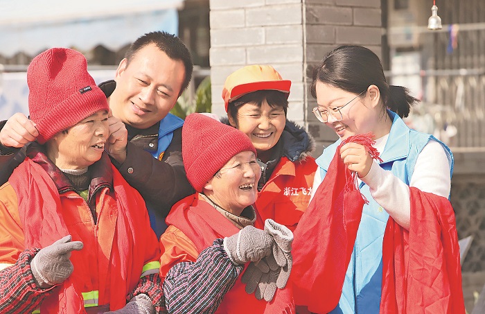 1月11日,浙江省臺(tái)州市路橋區(qū)螺洋街道總工會(huì)的干部為環(huán)衛(wèi)工人送上圍巾、棉帽、手套等御寒慰問(wèn)品。連日來(lái),螺洋街道總工會(huì)為寒冬里的環(huán)衛(wèi)工人、快遞小哥等送去保暖物品,傳遞工會(huì)組織的溫暖。本報(bào)通訊員 蔣友青 攝