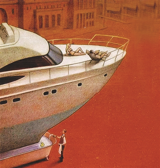 天旱河床成陸地,游艇上的人們?yōu)榱诉^(guò)把航行“癮”,請(qǐng)人在下面拼命注水,盡管船身紋絲不動(dòng),似卻在水聲中感受到愉悅。