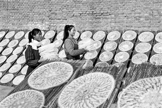 近年來(lái),河北省邢臺(tái)市廣宗縣按照民間傳統(tǒng)手工工藝做法,將綠豆深加工成綠色農(nóng)產(chǎn)品,讓傳統(tǒng)農(nóng)產(chǎn)品增值,助力農(nóng)民增收。圖為廣宗縣劉南蘇村村民在搬運(yùn)加工的綠豆粉皮。新華社發(fā)(張馳 攝)