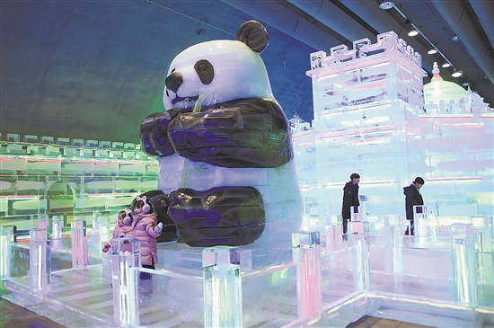 當(dāng)?shù)貢r(shí)間1月13日,在韓國(guó)江原道的華川山鱒魚節(jié)現(xiàn)場(chǎng),游客在哈爾濱工匠制作的大熊貓冰雕作品前留影。