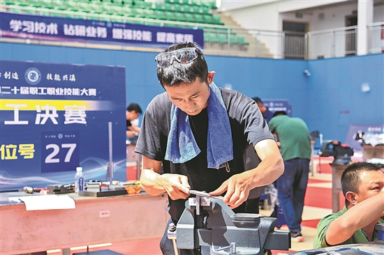 ④圖為第二十屆職工職業(yè)技能大賽鉗工技能比賽現(xiàn)場。