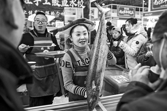 1月14日,北京,全國農(nóng)業(yè)展覽館,來自山東威海的鲅魚水餃商家正向市民介紹鲅魚產(chǎn)品,同時向市民分發(fā)煮熟的水餃產(chǎn)品進行品嘗。