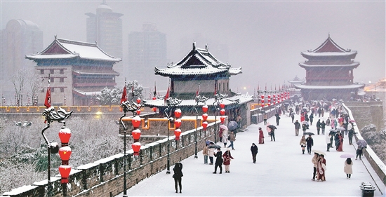 1月16日拍攝的西安城墻。當日,西安迎來降雪。1月15日起,陜西省多地迎來2024年首場降雪,交通、環(huán)衛(wèi)等部門及時響應,積極應對冰雪天氣。新華社記者 劉瀟 攝