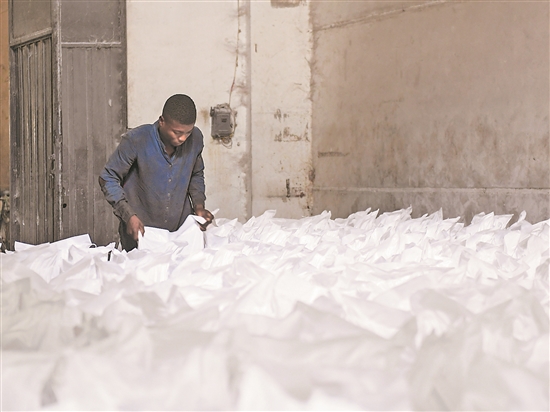 近日,在多哥阿尼耶制糖聯(lián)合企業(yè),一名工人將裝袋完畢的白糖擺放整齊。新華社記者 李亞輝 攝