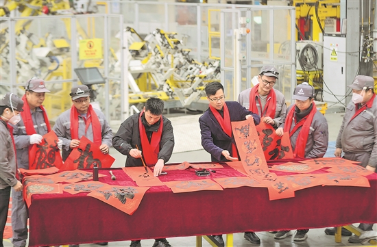 1月16日,浙江省湖州市莫干山高新區(qū)、德清縣阜溪街道總工會(huì)組織書(shū)法家志愿者走進(jìn)企業(yè)車(chē)間,為工人寫(xiě)春聯(lián)、送福字。