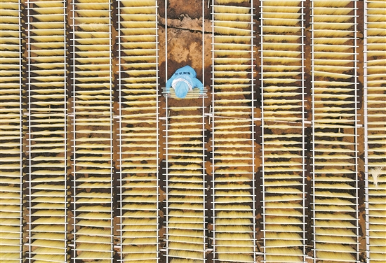 1月17日,在祁東縣黃土鋪鎮(zhèn),一家食品企業(yè)員工在晾曬粉絲(無人機照片)。