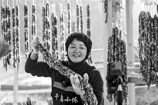 1月17日,在浙江省淳安縣浪川鄉(xiāng)沃潤農(nóng)業(yè)基地內(nèi),主播張會在直播銷售基地的土豬肉香腸。