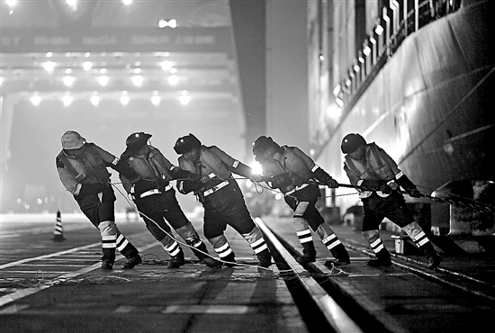 1月16日,工作人員在為剛靠泊碼頭的“巴赫”號集裝箱班輪固定纜繩。當晚,隨著大型集裝箱班輪“巴赫”號載著南美洲車厘子駛進天津港,天津港首條直通南美“車厘子快線”正式開通,保障京津冀地區(qū)市場供應。