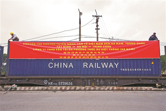 隨著中越經(jīng)貿(mào)合作日益加深,兩國多地的鐵路樞紐間形成了密集的中越班列線路。中國的鄭州、南寧、重慶、成都等地,以及越南的河內(nèi)、胡志明市等地,都是中越班列重要節(jié)點(diǎn)。中越班列開辟了中越物流運(yùn)輸新通道,大幅縮短了貨物運(yùn)輸時(shí)間。圖為近日在越南河內(nèi)東英車站,集裝箱裝車結(jié)束后,兩名工作人員爬至集裝箱頂部懸掛注明班次信息的橫幅。新華社記者 胡佳麗 攝