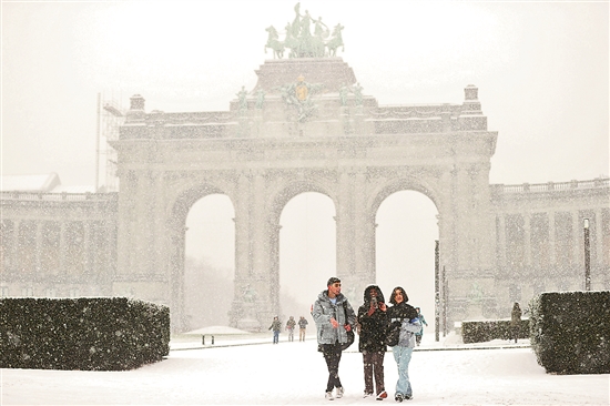 近日,比利時首都布魯塞爾迎來降雪。圖為在比利時布魯塞爾,人們冒雪在五十年宮公園游玩。