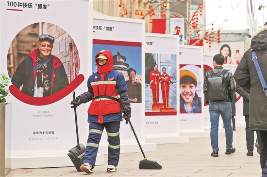 1月16日,北京王府井步行街上,“冬日笑臉影展”吸引了很多游客駐足,一名環(huán)衛(wèi)工人從“環(huán)衛(wèi)工人的笑臉”照片前走過。本報(bào)記者 吳凡 攝