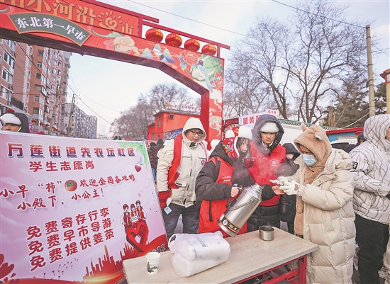 1月21日,在沈陽小河沿早市,志愿者為游客提供免費(fèi)熱水。