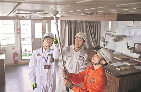1月22日,安檢員在??谛潞8蹤z查客滾船煙感探測器。