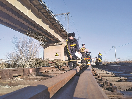 1月22日,在中國鐵路濟南局集團公司淄博工務(wù)段普速線路練功場,淄博線路車間青工張鶴檢查完工機具,上道進(jìn)行道岔檢查作業(yè)。