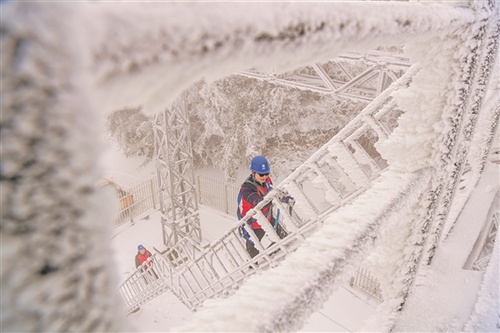1月23日,在重慶市酉陽土家族苗族自治縣涂市鎮(zhèn)麻田村,電力工人在覆冰觀測點(diǎn)檢查覆冰情況。