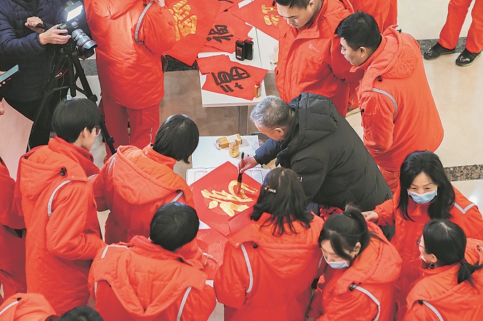 在送福活動(dòng)現(xiàn)場(chǎng),書(shū)法家和職工書(shū)法愛(ài)好者書(shū)寫(xiě)春聯(lián)和“?!弊郑瑸槁毠に蜕闲麓旱淖8?,增添了濃濃的年味和喜慶氣息。300多名職工參與活動(dòng),活動(dòng)送出春聯(lián)和“?!弊?000多副。本報(bào)特約記者 朱潤(rùn)勝 本報(bào)通訊員 崔婷婷 攝