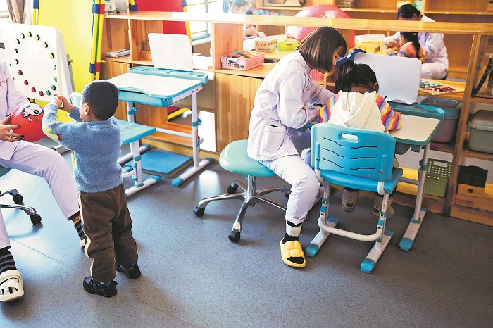 1月22日,內(nèi)蒙古自治區(qū)包頭市殘疾人康復中心,康復師正在幫助兒童進行康復訓練。該中心近三年累計為1000余人次殘疾兒童提供康復訓練服務。近年來,包頭市不斷完善制度,實現(xiàn)應救盡救,著力滿足殘疾兒童基本康復服務需求。本報記者 王偉偉 攝