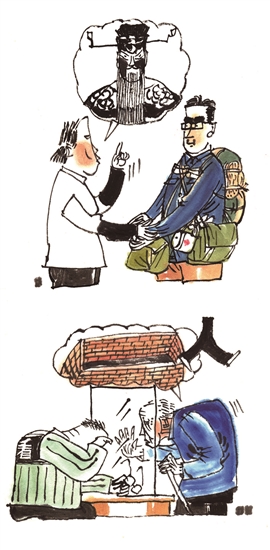 腐敗現(xiàn)象令人深惡痛絕,這種看法無(wú)須求證。漫畫家王進(jìn)城在處理這件作品時(shí),沒(méi)有提及主人公違了什么紀(jì),犯了什么法,讀者通過(guò)兩格畫面之間可以通過(guò)想象進(jìn)行“補(bǔ)白”??梢韵胂螅兄髌鸪跤涀×四赣H的話,做了很多有益于社會(huì)的工作;也可以想象,正是由于他的努力,他掌握了更大權(quán)力,以致后來(lái)的墮落給國(guó)家和人民造成更多損害。