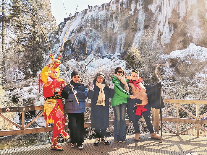 1月25日,游客在四川省九寨溝景區(qū)珍珠灘瀑布前與“悟空”“八戒”合影。珍珠灘瀑布是1986版《西游記》的取景地之一,也是九寨溝的一個(gè)標(biāo)志性景點(diǎn)。雖然冬季是九寨溝的旅游淡季,但隨著寒假到來(lái)和門(mén)票買(mǎi)一送一政策的刺激,每天前來(lái)九寨溝看水的游客仍然絡(luò)繹不絕。本報(bào)記者 畢振山 攝