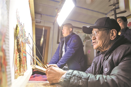 1月25日,呂正業(yè)的徒弟唐征(左后)在表演皮影戲。