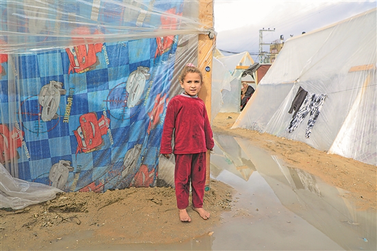 這是當(dāng)?shù)貢r間1月27日在加沙地帶南部城市拉法的一處臨時營地拍攝的巴勒斯坦兒童。受連日低溫降雨的影響,拉法臨時營地大量帳篷被淹,當(dāng)?shù)厝说牢C持續(xù)。新華社發(fā)(里澤克·阿卜杜勒賈瓦德 攝)