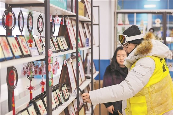 1月29日,一名全冬會(huì)工作人員在扎蘭屯市一文創(chuàng)產(chǎn)品店選購(gòu)商品。