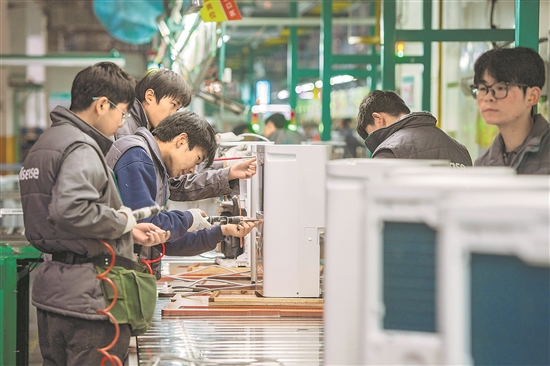 1月30日,位于浙江省湖州市長(zhǎng)興經(jīng)濟(jì)技術(shù)開發(fā)區(qū)的海信(浙江)空調(diào)有限公司外機(jī)車間內(nèi),來自長(zhǎng)興職教中心的學(xué)生正在裝配除濕機(jī)。