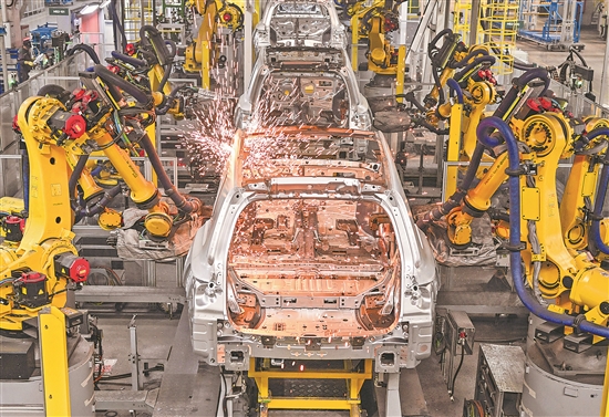 在理想汽車常州基地車間,機械手臂進行焊接作業(yè)(1月10日攝)。