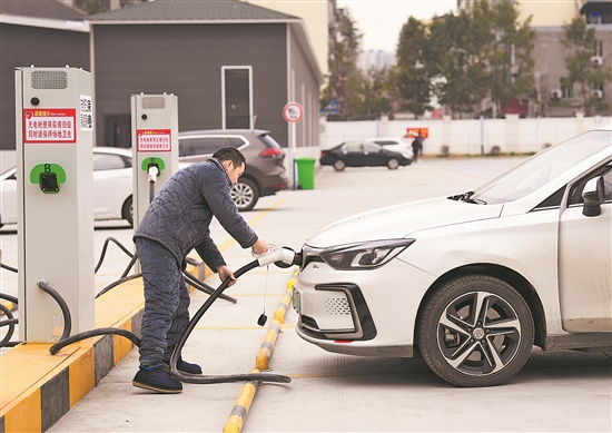 1月30日,出租車司機在江西九江火車站旁的“南鐵快充”停車場為新能源出租車充電。