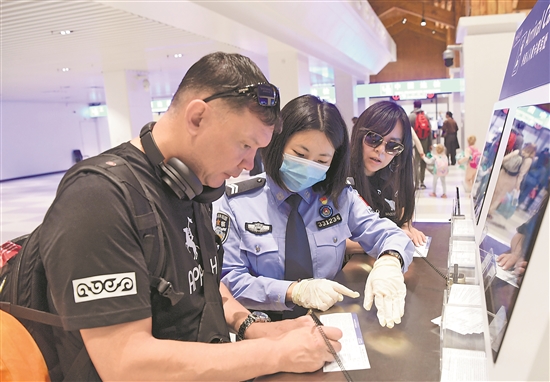 1月31日,在三亞鳳凰國際機(jī)場,鳳凰出入境邊防檢查站民警協(xié)助乘斯卡特航空公司DV473航班由阿拉木圖飛抵三亞的旅客填寫入境材料。