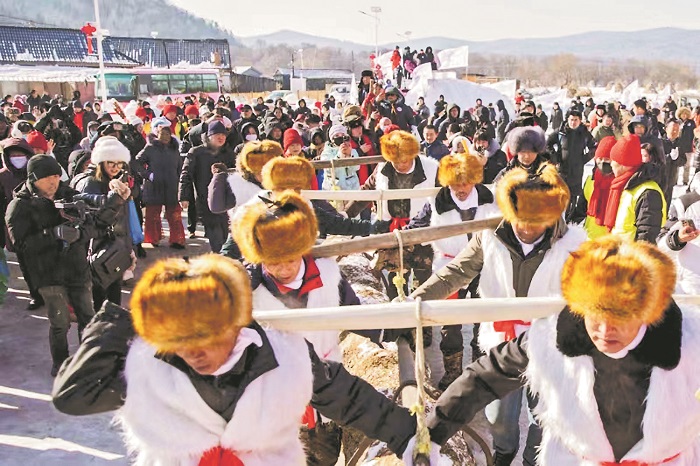 1月27日,吉林省安圖縣吉房子村,游客正與當(dāng)?shù)卮迕褚黄痼w驗民俗活動,感受“森林號子”這一國家級非物質(zhì)文化遺產(chǎn)的魅力,迎接即將到來的新春佳節(jié)。