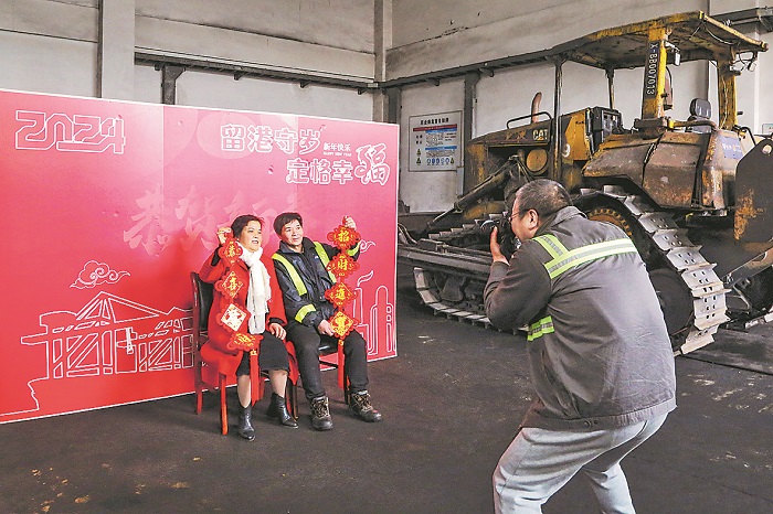 1月31日,吳水花穿上新買的大紅衣服坐上了開往寧波舟山港股份有限公司北侖礦石碼頭分公司寧鋼碼頭的專車。她丈夫陳必生是該碼頭裝卸工,這天公司舉辦“留港守歲,定格幸?!被顒?,為春節(jié)留守的職工拍攝全家福。蔣曉東 宋子琦 攝