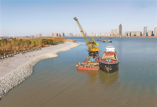圖為在安徽省蕪湖市鳩江區(qū)拍攝的長(zhǎng)江蕪湖河段整治工程建設(shè)工地現(xiàn)場(chǎng)。