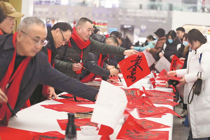 近日,江蘇省千名書(shū)法家送萬(wàn)福進(jìn)萬(wàn)家活動(dòng)在南京南站啟動(dòng),書(shū)法家現(xiàn)場(chǎng)寫(xiě)福送福,與來(lái)往南京的旅客共迎新春。活動(dòng)由江蘇省文聯(lián)、上海鐵路局文聯(lián)、鐵路南京站工會(huì)等部門(mén)單位聯(lián)合開(kāi)展。本報(bào)記者 劉金夢(mèng) 攝