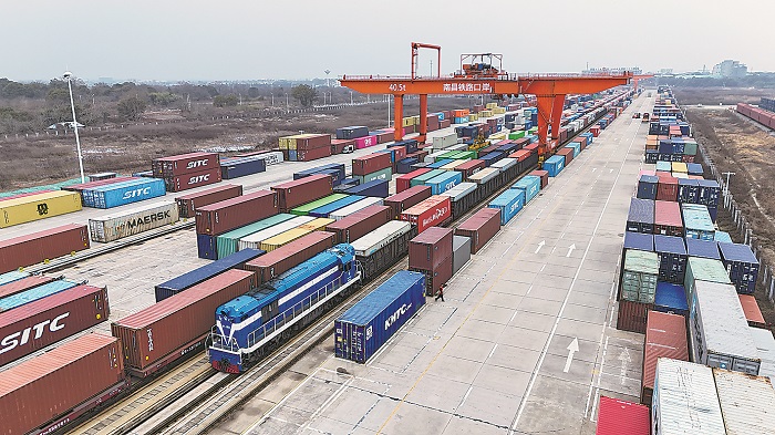 2月5日,一列滿載日用百貨、家用電器、服裝衣帽等年貨物資的集裝箱貨物列車駛出江西南昌向塘國際陸港,貨物運送至福建廈門港后,將轉由海運出口至歐美、東南亞等地。